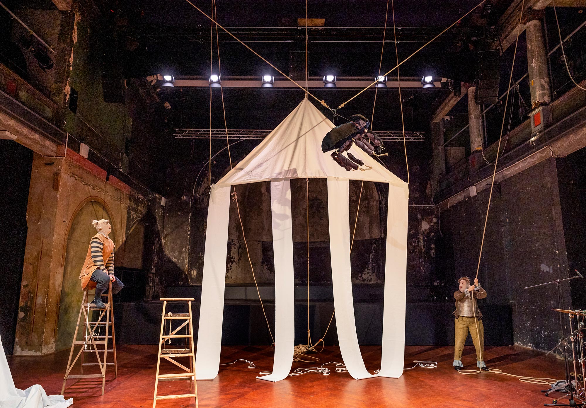 Also spielen sie – mit »Frieden«. Sie satteln den fäkalfreudigen Pillendreher und sich auf eine Jenseitsreise in höchste Höhen, hinein in die Sturmböen windiger Friedensarbeit. Dabei erzählen sie von Lebensfreude und harten Zeiten, von der Beglückung der Menschen und vom Donnern. Sie spielen mit Heldenmut und feigen Göttern, den Zutaten des Krieges und einem Lauch, mit Tumult, Waffenhändlern und anderen unliebsamen Gästen. Ob sie am Ende wohl von den Wolken wieder zurück auf den Teppich kommen? Da halten sie es wie immer: Vielleicht.